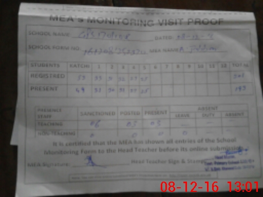 | Attendance Register | Head Teacher | MEA with School | Visit Proof |