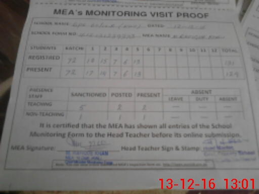 | Attendance Register | Head Teacher | MEA with School | Visit Proof |