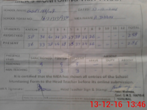 | Attendance Register | Head Teacher | MEA with School | Visit Proof |