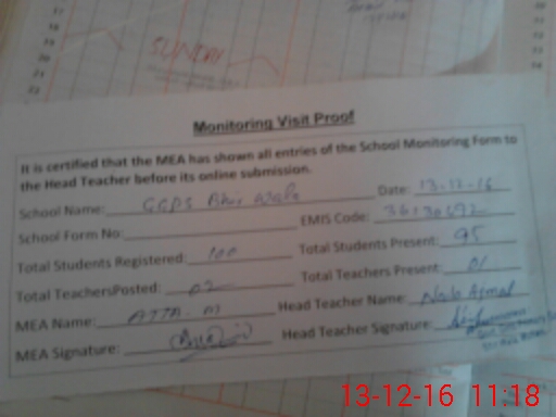 | School Visited by School Health & Nutrition Supervisor (No. of Visits) | 1 | Name1: | ZIA UR REHMAN | Name2: | |