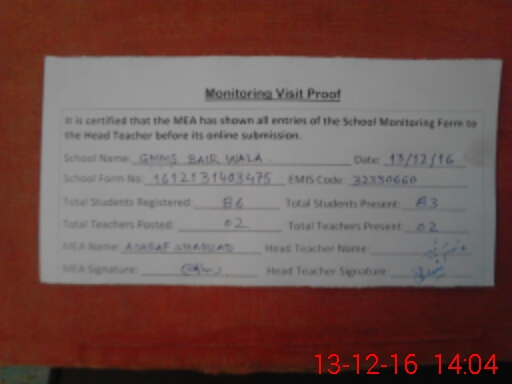 | EMIS Code: 32330660 | Name of School: GPS BAIR WALA | |||