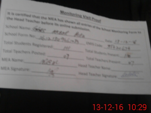 | Attendance Register | Head Teacher | MEA with School | Visit Proof |