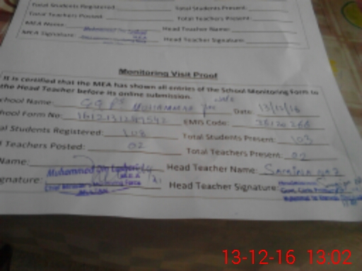 | Attendance Register | Head Teacher | MEA with School | Visit Proof |