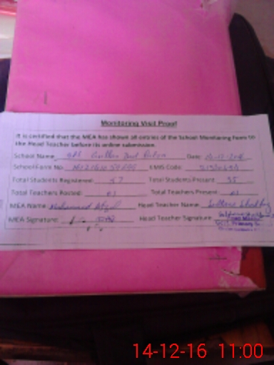 | Attendance Register | Head Teacher | MEA with School | Visit Proof |