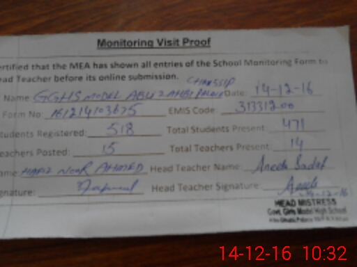 | Certified that this School was Inspected by the Undersigned MEA/DMO Today and the Information Stated Above is as Per Record. | |||||