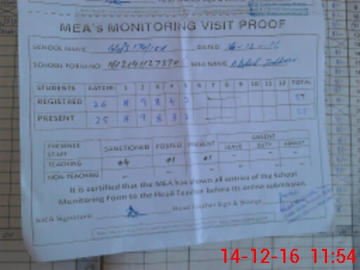| Attendance Register | Head Teacher | MEA with School | Visit Proof |