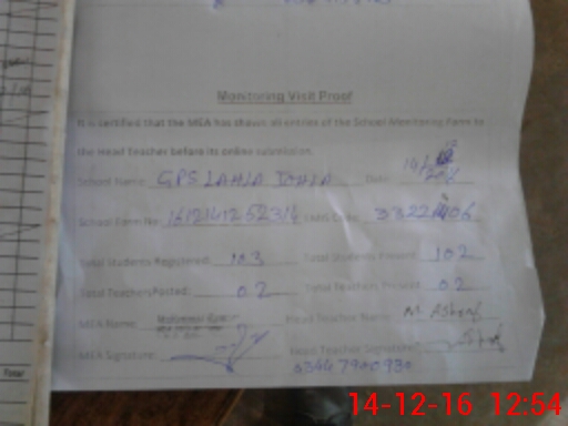 | EMIS Code: 33221406 | Name of School: GPS LAHLA JOHLA (April-2016) | |||