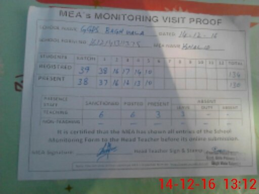 | EMIS Code: 36430368 | Name of School: GMPS BAGH WALA, TULAMBA | |||