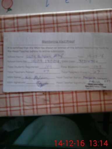 | Attendance Register | Head Teacher | MEA with School | Visit Proof |