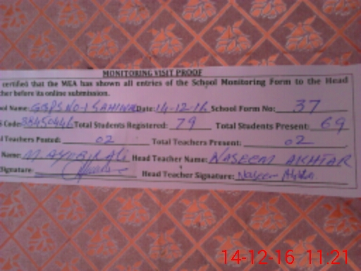 | EMIS Code: 38450446 | Name of School: GGPS NO.1 SAHIWAL | |||