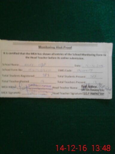 | Attendance Register | Head Teacher | MEA with School | Visit Proof |
