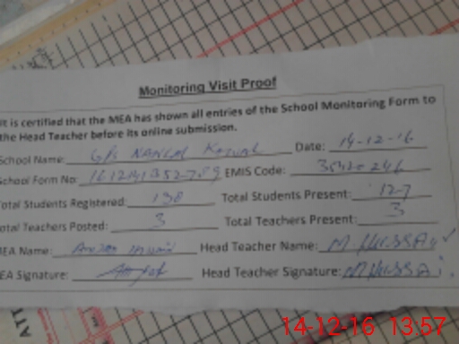 | Attendance Register | Head Teacher | MEA with School | Visit Proof |