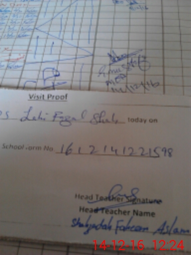 | School Visited by School Health & Nutrition Supervisor (No. of Visits) | 1 | Name1: | Faisal Nisar | Name2: | |