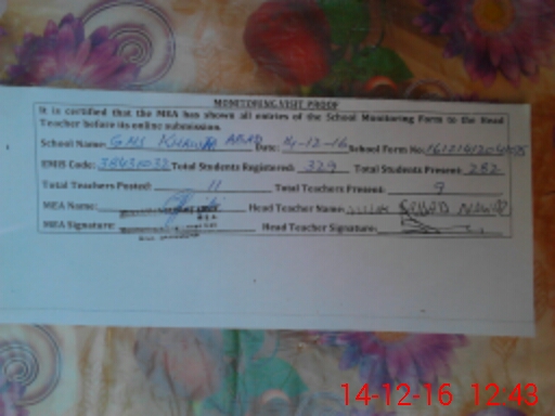 | Attendance Register | Head Teacher | MEA with School | Visit Proof |