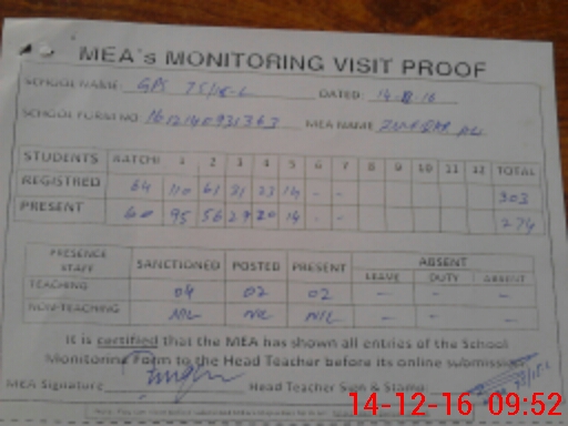 | Attendance Register | Head Teacher | MEA with School | Visit Proof |