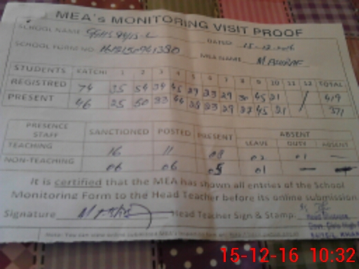 | Attendance Register | Head Teacher | MEA with School | Visit Proof |