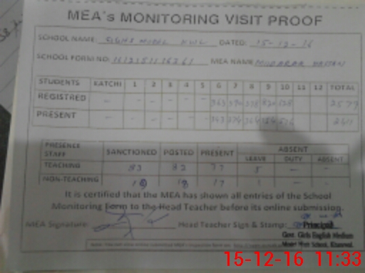 | Certified that this School was Inspected by the Undersigned MEA/DMO Today and the Information Stated Above is as Per Record. | |||||