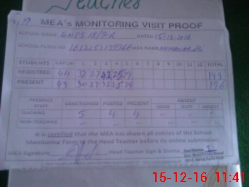 | Attendance Register | Head Teacher | MEA with School | Visit Proof |
