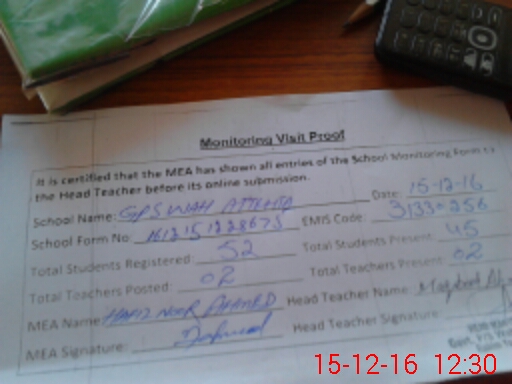 | Attendance Register | Head Teacher | MEA with School | Visit Proof |