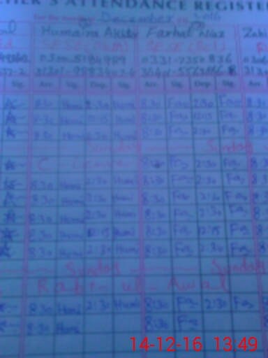 | CNIC | Full Name | Designation | R/C | Absence During Last Calender Month |