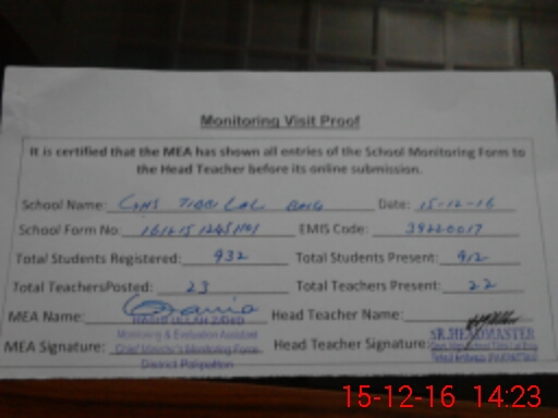 | Attendance Register | Head Teacher | MEA with School | Visit Proof |