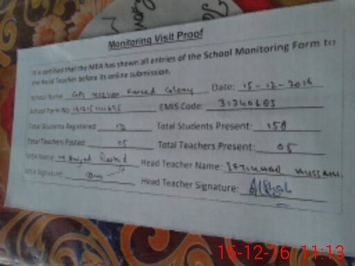 | EMIS Code: 31340685 | Name of School: GPS MAZHAR FARID COLONY | |||