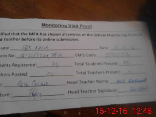 | Attendance Register | Head Teacher | MEA with School | Visit Proof |