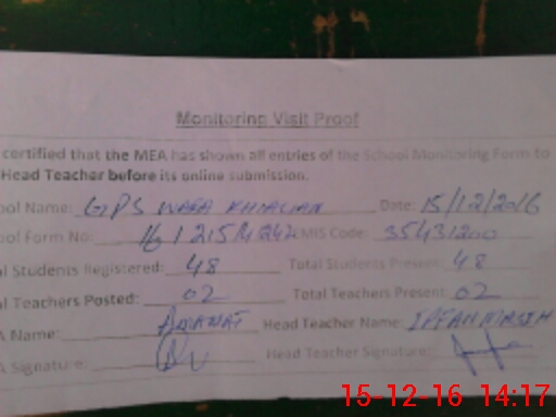 | Attendance Register | Head Teacher | MEA with School | Visit Proof |