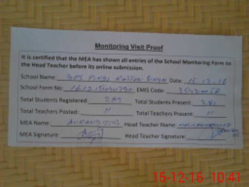 | Attendance Register | Head Teacher | MEA with School | Visit Proof |