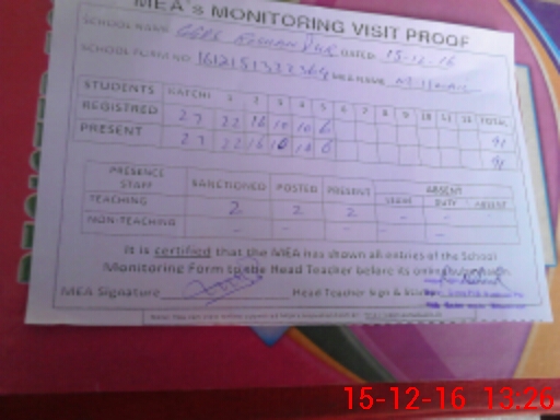 | Attendance Register | Head Teacher | MEA with School | Visit Proof |