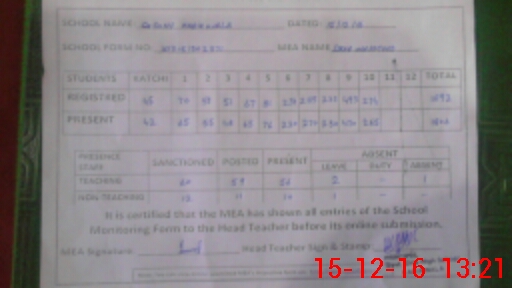 | Attendance Register | Head Teacher | MEA with School | Visit Proof |