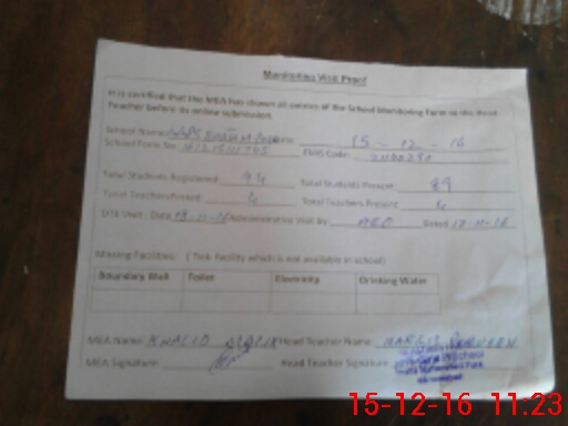 | Certified that this School was Inspected by the Undersigned MEA/DMO Today and the Information Stated Above is as Per Record. | |||||