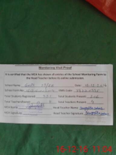 | Attendance Register | Head Teacher | MEA with School | Visit Proof |