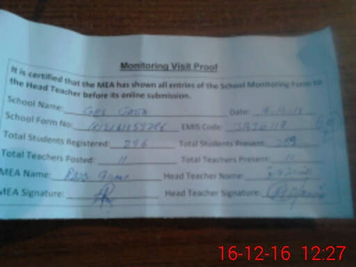 | Attendance Register | Head Teacher | MEA with School | Visit Proof |