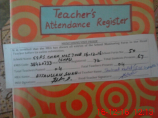 | Attendance Register | Head Teacher | MEA with School | Visit Proof |