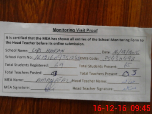| Attendance Register | Head Teacher | MEA with School | Visit Proof |