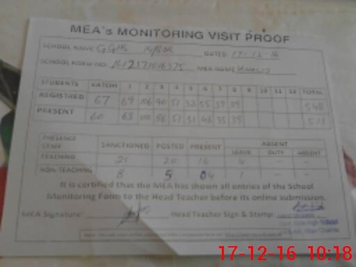 | Attendance Register | Head Teacher | MEA with School | Visit Proof |