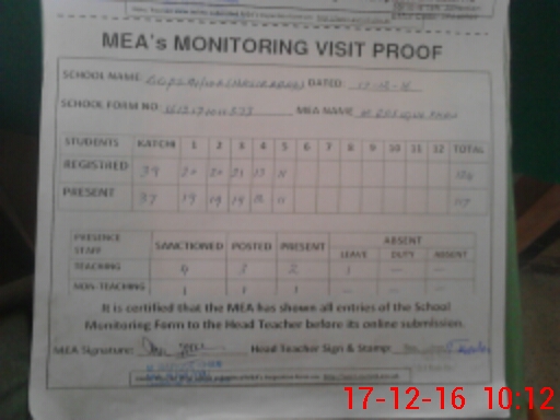 | Attendance Register | Head Teacher | MEA with School | Visit Proof |