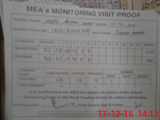 | Attendance Register | Head Teacher | MEA with School | Visit Proof |