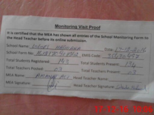 | Attendance Register | Head Teacher | MEA with School | Visit Proof |