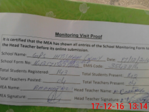| Attendance Register | Head Teacher | MEA with School | Visit Proof |