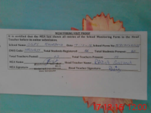 | Attendance Register | Head Teacher | MEA with School | Visit Proof |
