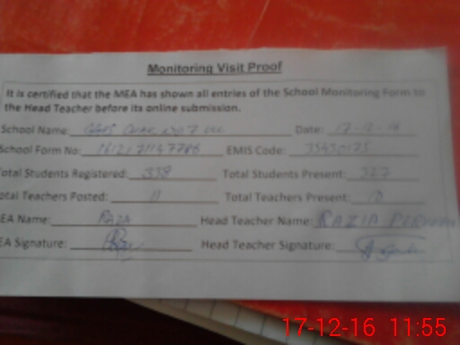 | Attendance Register | Head Teacher | MEA with School | Visit Proof |