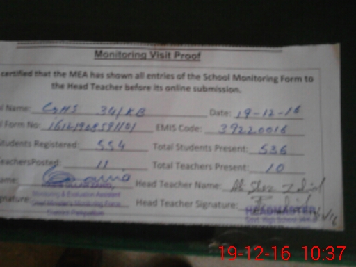 | EMIS Code: 39220016 | Name of School: GHS CHAK NO.34/KB | |||
