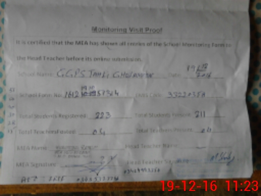 | Attendance Register | Head Teacher | MEA with School | Visit Proof |