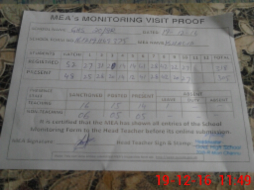 | Attendance Register | Head Teacher | MEA with School | Visit Proof |
