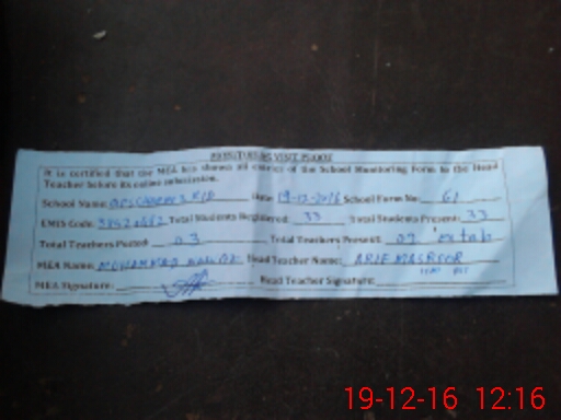 | Attendance Register | Head Teacher | MEA with School | Visit Proof |