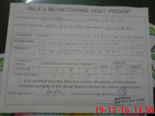 | Certified that this School was Inspected by the Undersigned MEA/DMO Today and the Information Stated Above is as Per Record. | |||||