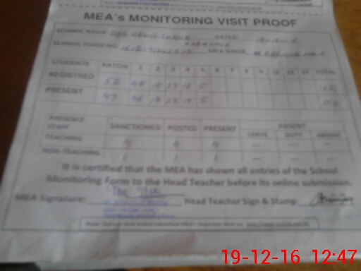 | Attendance Register | Head Teacher | MEA with School | Visit Proof |