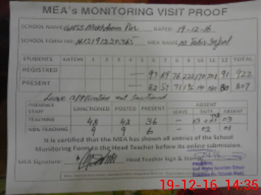 | Attendance Register | Head Teacher | MEA with School | Visit Proof |